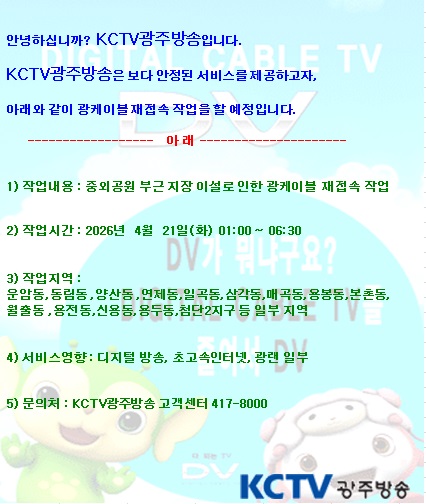 | Á¦¸ñ | 2026³â 4¿ù 21ÀÏ Á߿ܰø¿ø ºÎ±Ù ÁöÀåÀ̼³·Î ÀÎÇÑ ±¤ÄÉÀ̺í ÀçÁ¢¼Ó ÀÛ¾÷ |